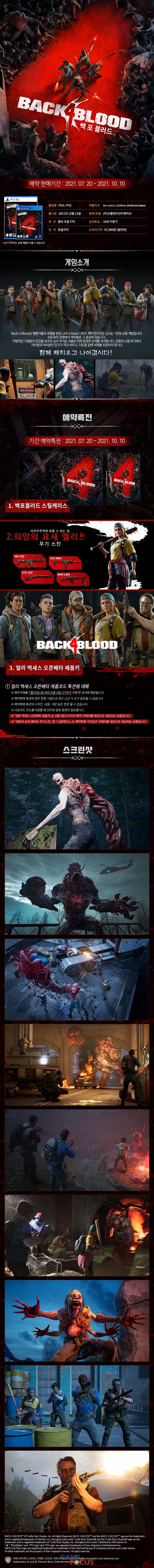 백 포 블러드는 호평속에 스테디셀러로 자리잡은 '레프트 4 데드' 프랜차이즈의 제작진이 만들어낸 1인칭 협동 좀비 슈터 게임으로, 매 순간이 다이나믹한 게임플레이와 높은 다양성 및 커스터마이즈 기능들을 통해 플레이어를 끊임없이 몰입하게 만든다.