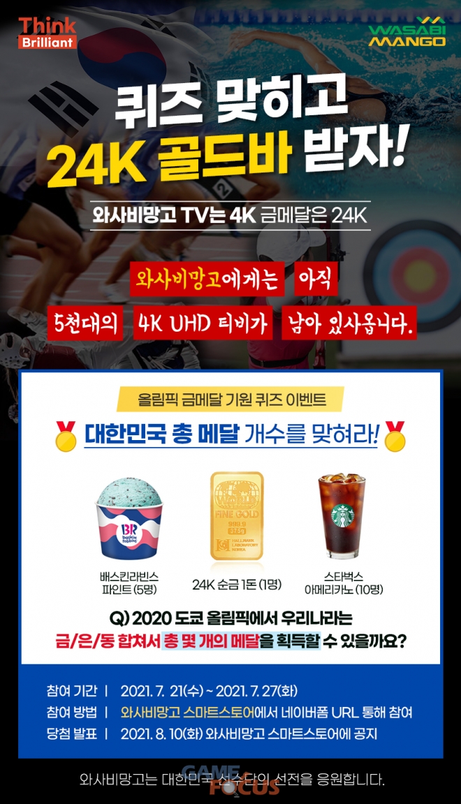 와사비망고 마케팅 담당자는 “대한민국 선수단의 선전을 응원하기 위해 이번 퀴즈 이벤트를 기획했다”면서 “힘든 시기에 진행하는 올림픽인 만큼 외부가 아닌 집에서 TV를 통해 감동의 순간을 함께 하시길 바란다”고 밝혔다.