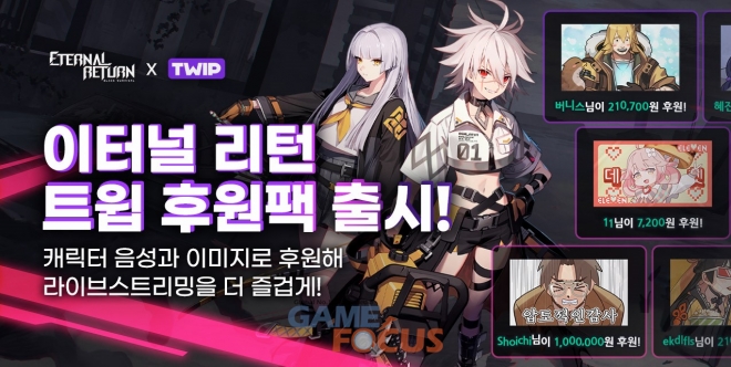기존 '트윕' 후원 이미지는 서비스 내에서 기본 제공하는 것과 스트리머가 설정한 이미지만 사용 가능했으나, '이터널 리턴 팩'이 출시됨에 따라 자신이 원하는 것을 선택해 후원할 수 있다.