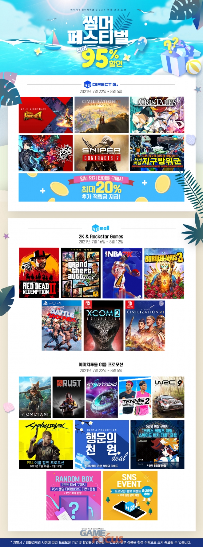 에이치투 인터렉티브(대표 허준하)가 디지털 유통 서비스인 다이렉트 게임즈와 패키지 쇼핑몰인 H2몰에서 오늘(7월 22일)부터 여름 프로모션을 비롯한 다양한 이벤트를 진행한다.
