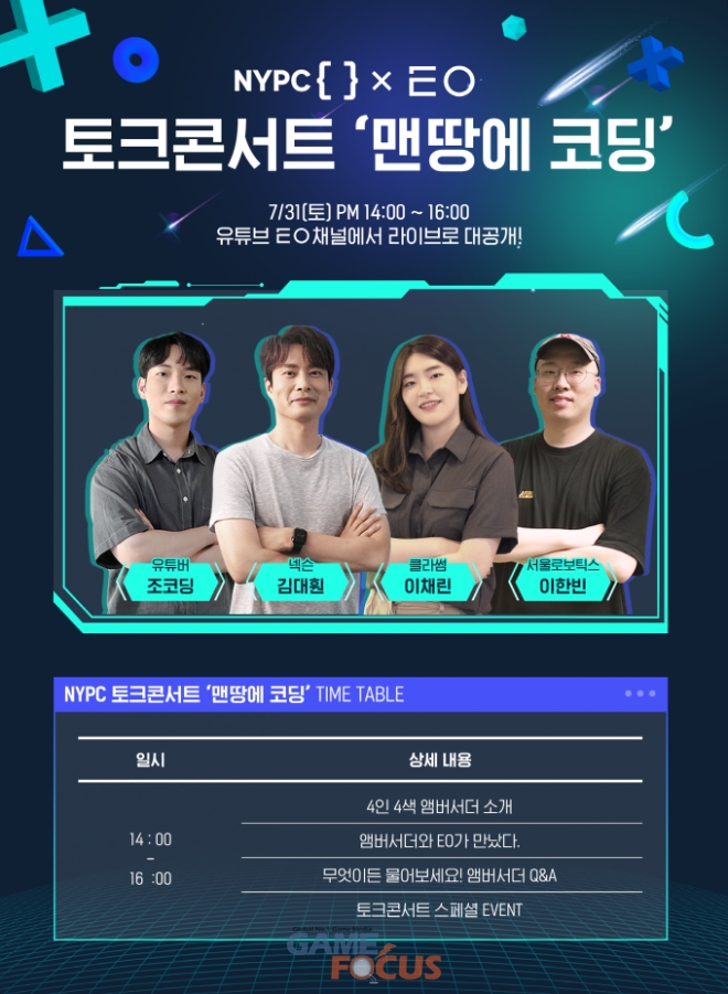 ‘맨땅에 코딩’을 주제로 진행되는 2021년 ‘NYPC 토크콘서트’에는 넥슨 신규 개발 총괄 김대훤 부사장, 교육 소통 플랫폼 클라썸의 이채린 대표, 인공지능 소프트웨어 개발사 서울로보틱스의 이한빈 대표, 코딩 전문 유튜버 ‘조코딩’ 등이 공식 앰버서더로 참여한다.