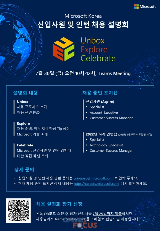 ‘Unbox, Explore, Celebrate’를 주제로 열리는 이번 채용설명회는 마이크로소프트의 조직문화와 다양한 직무에 대한 취업 준비생들의 궁금증을 해소하는 자리다. 7월 30일 오전 10시부터 2시간 동안 마이크로소프트 협업 플랫폼 팀즈를 통해 온라인으로 진행한다.