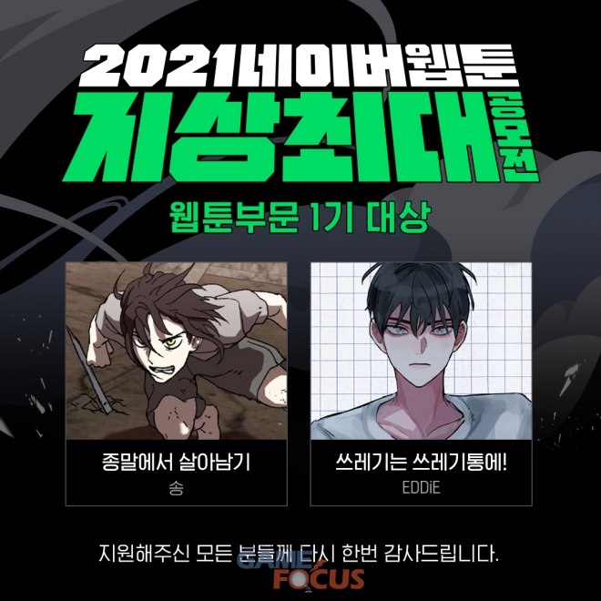 금일(28일) 네이버웹툰에 따르면 '2021 지상최대공모전' 웹툰 부문 1기 대상으로 송 작가의 '종말에서 살아남기'와 EDDiE 작가의 '쓰레기는 쓰레기통에!'가 선정됐다.