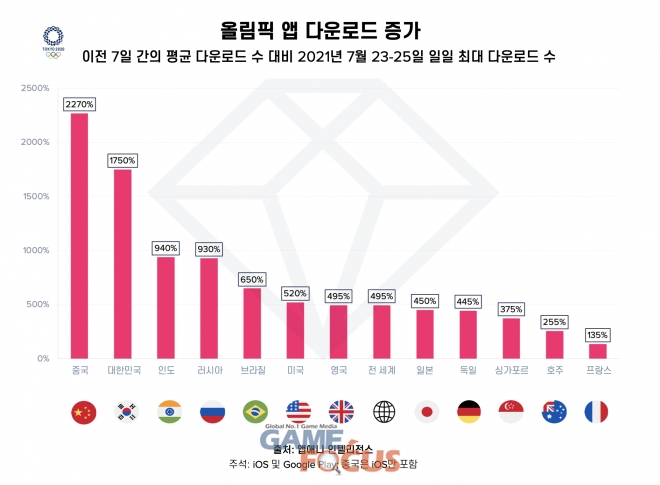 앱애니가 IOC의 공식 '올림픽' 앱의 올림픽 첫 3일(23일~25일)중 일일 최대 다운로드 수와 그 전 7일의 다운로드 평균을 비교한 결과, 한국은 1,750%의 다운로드 증가율을 기록하며 2,270%를 기록한 중국 다음으로 가장 높은 다운로드 증가율을 기록한 것으로 나타났다. 3위는 940%를 기록한 인도가 차지했다.