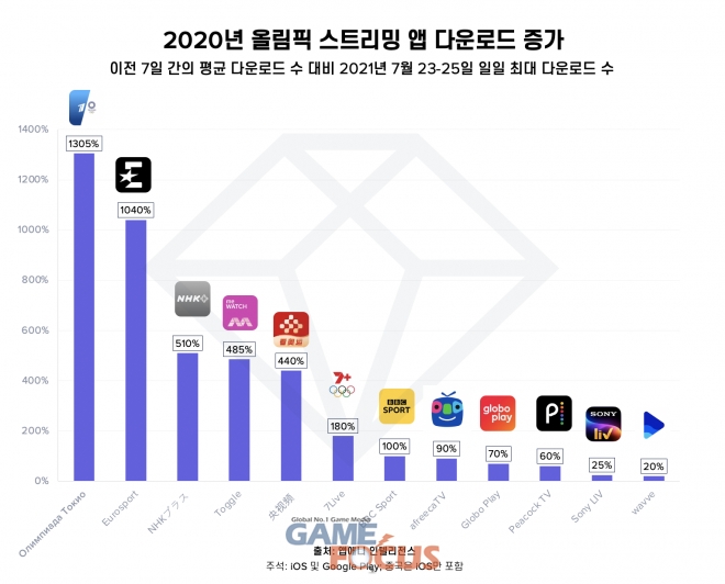 러시아에서는 16일에 런칭한 '도쿄 올림픽'의 다운로드가 1,305% 증가했으며 유럽의 '유로스포츠'는 1,040%, 영국의 'BBC스포츠'는 100%의 신규 다운로드 증가율을 기록한 것으로 밝혀졌다. 개최국 일본은 개회식 전 3일간 다운로드 79위에 머물던 'NHK 플러스'가 개회식 이후 3일동안 가장 많이 다운로드 된 앱 11위에 오르는 모습을 보였다.