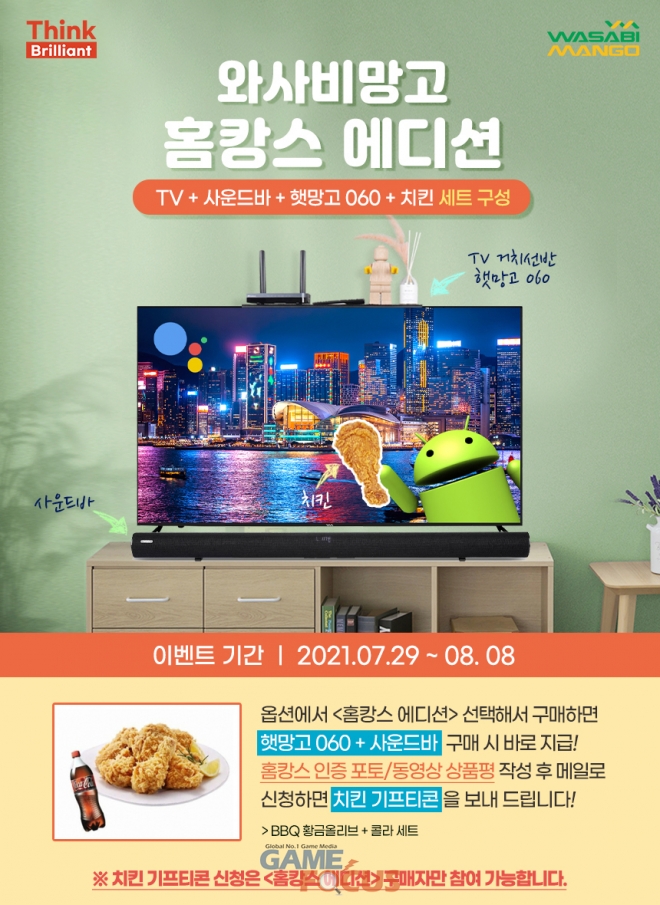 7월 29일부터 8월 8일까지 진행하는 홈캉스 에디션은 와사비망고 4K UHD TV 구매 시 10만 원 상당의 사운드바와 TV 거치대, 치킨 모바일 쿠폰을 4만 원의 추가 구성 상품으로 구매할 수 있어 약 6만 원 이상의 할인 혜택을 제공한다.