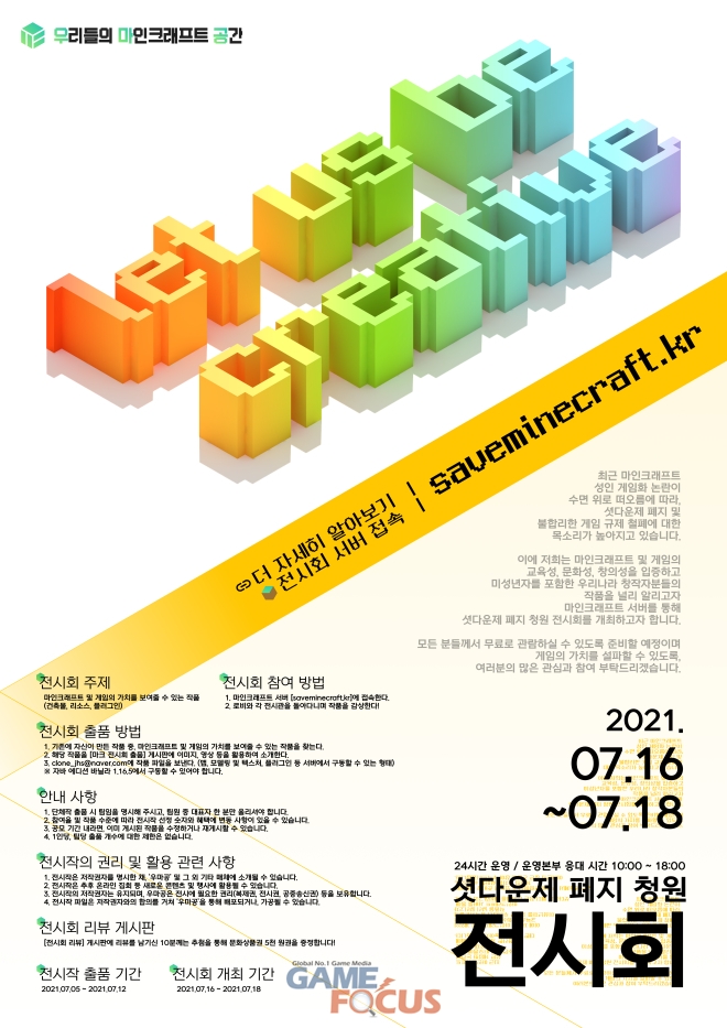 지난 16일~18일, 22일~24일 총 2부에 걸쳐 운영된 셧다운제 폐지 청원 전시회에는 마인크래프트를 통해 제작된 국내 창작자들의 작품이 전시됐다. 전시회는 'Let Us Be Creative'를 주제로 전시회에 참여한 미성년 게이머들의 창의성은 물론 게임의 가치를 담아냈다.