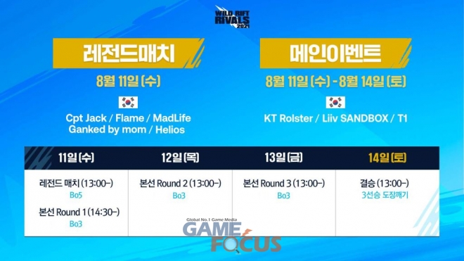 개막일인 11일 열리는 레전드 매치에는 LCK 대표로 '매드라이프' 홍민기, '캡틴잭' 강형우, '갱맘' 이창석, '헬리오스' 신동진, '플레임' 이호종이 나서며 LPL 대표로는 'Moyu' 시옹후이동, 'LoveLing' 인 레, 'Misaya' 유징시, 'PiPiXuan' 피샤오슈안, 'CoLiN' 카오하이가 출전한다. 레전드 매치는 5전3선승제로 진행된다.