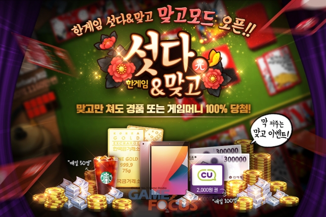 한게임 섯다&맞고는'맞고모드' 오픈을 기념해 오는 8월 26일까지 이벤트를 진행하고, ▲ 1등 순금 20돈(2명) ▲ 2등 아이패드 8세대(5명) ▲3등 신세계 상품권 30만원권(10명) 등 푸짐한 경품을 증정한다. 특히▲ 4등 스타벅스 아메리카노권(50명)과▲ 5등 CU 상품권 2천원권 (100명)은 매일 150명에게 제공될 예정이다.