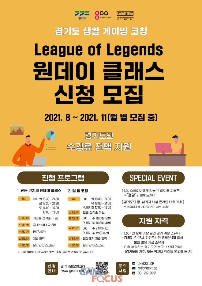'LOL 원데이 클래스'는 월 32명, '팀업코칭은' 월 36명(8팀)까지 모집해 11월까지 총 272명의 경기도 게이머를 지원할 예정이다. 신청 조건은 개인 클래스의 경우 거주지가 경기도거나 학교나 직장을 경기도에 둔 도민이라면 누구나 신청이 가능하다. 단, 팀단위 신청은 리그오브레전드의 경우 팀원 5명 중 3명 이상, 배틀그라운드의 경우 팀원 4명 중 3명 이상이 조건을 만족해야 한다.