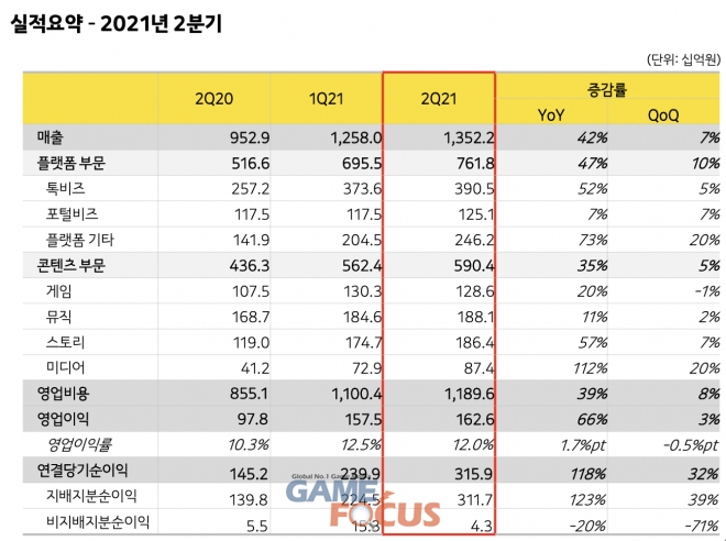 카카오(공동대표 여민수, 조수용)가 K-IFRS(한국국제회계기준) 기준 2021년 2분기 매출이 전 분기 대비 7%, 전년 동기 대비 42% 늘어난 1조3,522억원을 기록했다고 밝혔다. 영업이익은 전 분기 대비 3%, 전년 동기 대비 66% 증가한 1,626억원으로, 영업이익률은 12%다.