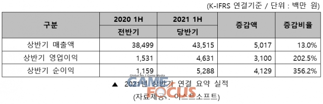 이스트소프트의 2021년도 상반기 연결 실적의 상세 내역은 금융감독원 전자공시시스템에서 확인할 수 있다.