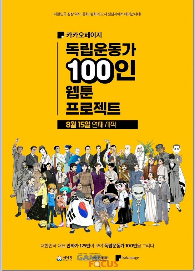 카카오엔터테인먼트가 성남문화재단과 함께 독립운동가들의 발자취를 웹툰으로 조명하는 뜻 깊은 웹툰 시리즈인 '독립운동가 100인 웹툰 프로젝트'를 제76회 광복절인 8월 15일 카카오페이지를 통해 공개한다.