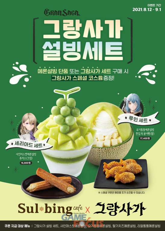 이번 제휴를 통해 설빙의 대표 메뉴와 '그랑사가'의 인기 캐릭터를 활용한 '그랑사가 설빙 세트' 2종을 선보이며, 오는 9월 1일까지 전국 설빙 매장 및 배달앱 등을 통해 주문 가능하다.