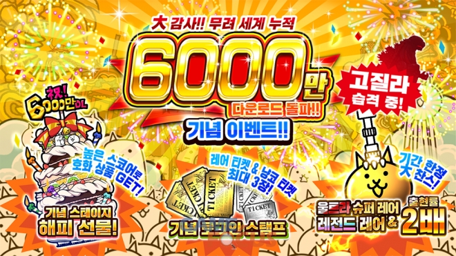 포노스(대표 츠지코 요리카츠)가 병맛&귀염 타워디펜스 게임 '냥코 대전쟁'의 전세계 누적 6000만 다운로드 기념 이벤트와 '고질라'와의 기간 한정 콜라보레이션 이벤트를 2021년 8월 16일(월) 11시부터 동시에 개최한다.
