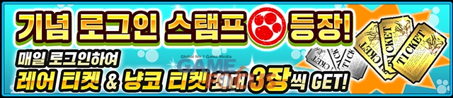 개최 기간 중 매일 로그인하면 레어 티켓 & 냥코 티켓을 최대 3장씩 획득할 수 있는 기념 로그인 스탬프 캠페인을 실시한다.