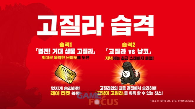 '고질라'와의 최종 결전에서 승리하면 '고양이 고질라'를 획득할 수 있다. 최강의 파괴신 '고질라'와의 대전에 꼭 도전해보자.