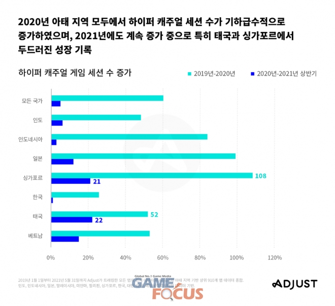 비 하이퍼 캐주얼 게임의 경우 2020년 세션 수가 가장 높았던 국가는 일본과 인도네시아로, 전년 동기 대비 각 42%, 26% 증가했다. 나아가 2021년 상반기에는 싱가포르와 베트남이 가장 높은 세션 수를 기록했으며, 싱가포르의 경우 전년 동기 대비 무려 151%, 베트남의 경우 62% 증가한 것으로 나타났다. 한국은 2020년 비 하이퍼 캐주얼 게임 세션 수가 전년 동기 대비 25% 증가했으며, 2021년 상반기에는 21% 증가했다. 또한, 비 하이퍼 캐주얼 게임의 경우 작년 4분기 기준 30일차 평균 리텐션율이 5.64%였던 반면 하이퍼 캐주얼 게임의 경우 단 1.69%에 불과한 것으로 나타났다.