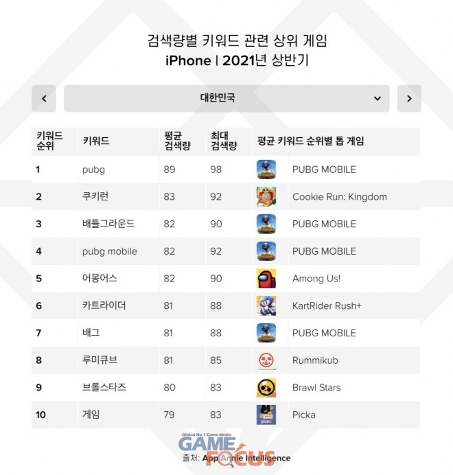 2021년 상반기 한국 앱스토어에서 가장 많이 검색된 게임은 ‘펍지모바일’인 것으로 드러났다. 앱애니가 발표한 앱스토어 검색량별 키워드 관련 상위 게임을 살펴보면 ‘펍지모바일’ 관련 키워드가 1위, 3위, 4위 그리고 7위를 차지한 것으로 밝혀졌다.