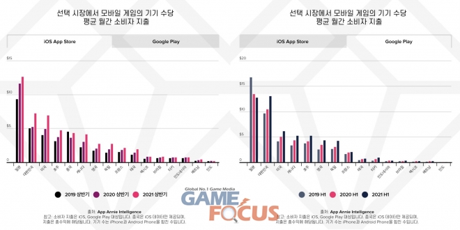 앱애니가 상위 3개 국가(일본, 한국, 미국)를 조사한 결과 모바일 기기 1개당 월간 평균 지출은 9달러인 것으로 나타났다. 2021년 1분기 한국의 모바일 기기 1개당 평균 월간 소비자 지출은 앱스토어 기준 7.2달러, 구글플레이 기준 13달러로 밝혀졌으며 한국은 이번 상반기 구글플레이 기준 세계 1위, 앱스토어 기준 세계 2위의 평균치를 보였다.