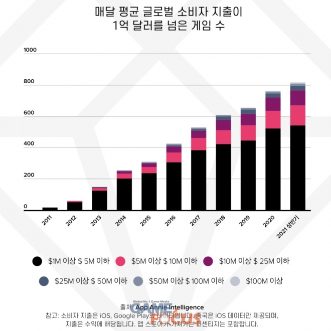 앱애니가 발표한 자료에 따르면 2021년 상반기 매달 100만 달러(약 11억 7190만 원) 이상의 매출을 기록한 게임은 810개 이상이며, 그중 7개 게임은 1억 달러(약 1천 171억 원) 이상의 매출을 올린 것으로 나타났다. 2019년 1억 달러 이상의 매출을 기록한 게임은 단 두 개에 불과했다.