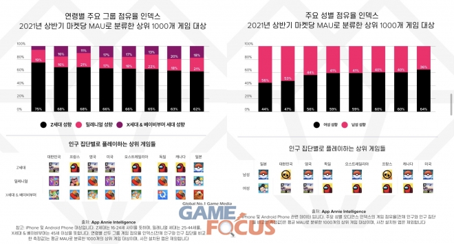 앱애니가 2021년 상반기 MAU기준 상위 1000개 모바일 게임의 사용자를 분석한 결과, 한국의 상위 모바일 게임 사용자의 75%가 Z세대인 것으로 나타났다. 밀레니얼 세대는 19%, X세대는 6%로 밝혀졌으며 각 세대별로 가장 선호하는 게임은 Z세대 ‘로블록스’, 밀레니얼세대 ‘꿈의 집’ X세대 ‘피망뉴맞고’로 나타났다. 성별 기준으로 살펴보면, MAU 기준 상위 1000개 게임에서 남녀 비중은 53:47으로 남성들에게는 ‘브롤스타즈’가, 여성들에게는 ‘로블록스’가 가장 인기 있는 게임인 것으로 밝혀졌다.
