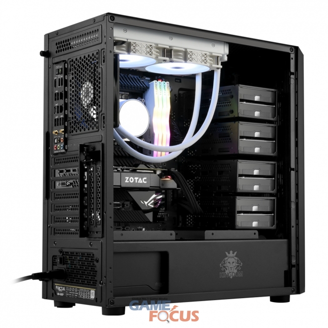 케이스 전면부는 메시 타입의 베젤과 대형 140mm 쿨링팬 3개를 배치하여 외부의 차가운 공기를 시스템 내부에 유입시킬 수 있도록 했다. 제품 후면에는 1개의 120mm 팬이 장착되어 있으며, 상단에는 최대 3열의 수냉 쿨러 장착이 가능하도록 별도의 공간을 마련해 두었다. 특히 발열에 취약한 강화 유리나 아크릴 재질의 측면 패널 대신하여, 촘촘한 에어홀로 구성된 사이드 패널을 기본 장착한 것도 이 제품만의 특징이다. 즉 킹덤 클라시코 스토리지 마스터는 화려한 튜닝 요소를 최소화하고, 모던한 디자인과 시스템 쿨링에 중점을 두고 제작된 제품이다.