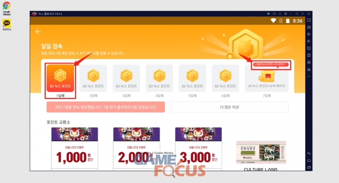 일주일 간 진행되는 본 이벤트는 녹스앱플레이어 내 녹스 상점 출석체크만 해도 평소보다 16배가 높은 포인트 수령이 가능하며 7일 만기 출석 시 추가로 500 포인트가 주어진다. 7일 출석체크 완료 시 사용자는 무조건 1000P를 획득할 수 있다.