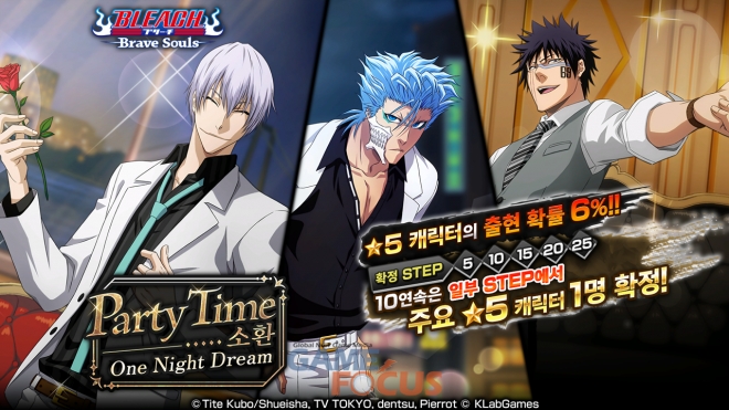 KLab 주식회사(본사: 일본 도쿄도 미나토구, 대표이사 사장: 모리타 히데카츠, 이하 KLab)가 서비스 중인 온라인 모바일, PC 3D 액션 게임 'BLEACH: Brave Souls(블리치 브레이브 소울즈, 이하 브레이브 소울)'이 31일 16:00부터 '파티 타임 소환 – 원 나이트 드림 -(Party Time Summon -One Night Dream-)'을 시작한다. 이번 소환에 추가된 새로운 ★5 캐릭터는 '이치마루 간', '그림죠 재거잭', '히사기 슈헤이'다.