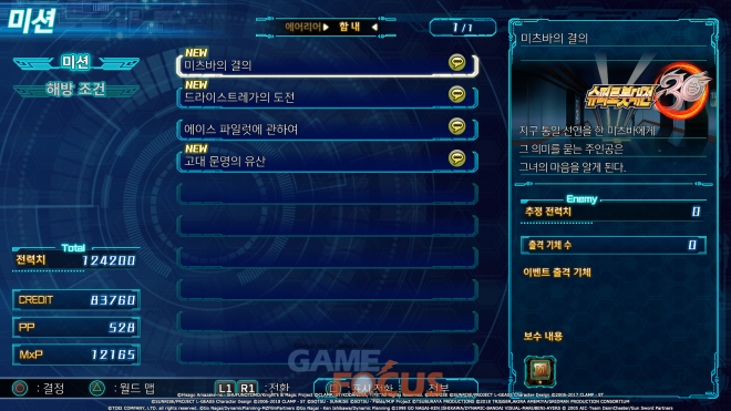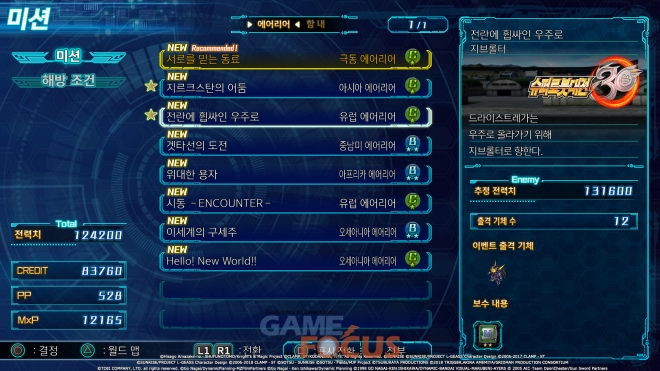 선택한 미션의 내용: 미션 이름 및 개요, 추정 전력치(적의 강한 정도), 아군의 출격 기체 수, 이벤트 출격 기체(이벤트로 반드시 출격하는 기체)를 알 수 있다.