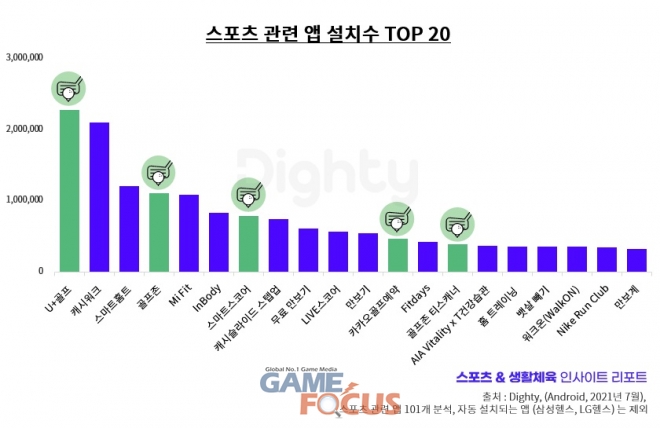 최근 젊은 세대의 유입 등으로 골프 시장과 플랫폼이 호황을 이어가고 있는 가운데, 골프 인구는 여전히 중장년층 남성의 비중이 높은 것으로 확인됐다. 7월 기준 스포츠 관련 앱 중 설치 수가 가장 많은 앱은 골프 서비스 플랫폼 'U+골프'였다. 설치 수 10위권에는 'U+골프'를 비롯해 '골프존', '스마트스코어' 등 골프 관련 앱 3개가 포함됐다.