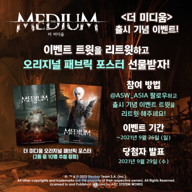 아크시스템웍스 아시아지점은 '더 미디움' 한국어판의 출시를 기념하여, 추첨을 통해 <더 미디움 오리지널 패브릭 포스터>를 총 10명에게 증정하는 이벤트를 오늘부터 개최한다. 참여 방법 등 이벤트에 대한 자세한 내용은 다음과 같다.