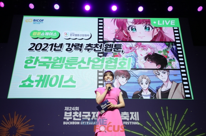 만화축제는 이날 오후 2시 한국만화박물관 상영관에서 열린 '2021년 강력 추천 웹툰, 한국웹툰산업협회 쇼케이스'를 통해 한국웹툰산업협회가 추천하는 협회 회원사의 다양한 웹툰 연재 예정 작품들을 조명하는 자리를 마련했다.