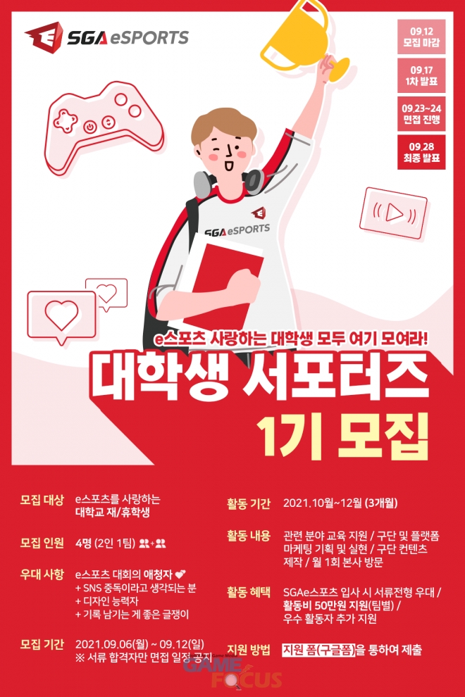 SGAe스포츠가 e스포츠를 사랑하는 대학생들을 대상으로 'SGAe스포츠 서포터즈 1기'를 공개 모집한다고 밝혔다. 이번 서포터즈는 e스포츠 대회의 애청자를 우대하며 SNS를 자유자재로 활용하거나, 다양한 디자인 능력을 보유하고, 기록을 남기는데 일가견이 있는 라이터를 우대한다. 활동 결과는 추후 다양한 형태의 포트폴리오로 활용 가능하다.