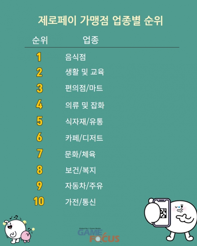 업종별 가맹 현황을 살펴보면 음식점이 29만 7000여개로 가장 많았고, 생활 및 교육업이 23만개, 편의점 및 마트가 10만여개로 뒤를 이었다. 제로페이는 편의점부터 동네 마트, 병·의원, 약국, 미용실, 실내 체육센터 등까지 다양한 소상공인 가맹점에서 이용되고 있다.