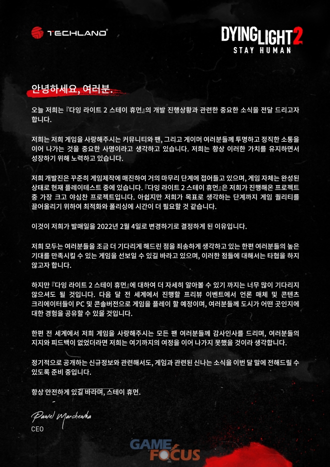 (주)디지털터치(대표 정성헌)는 Techland에서 개발한 PlayStation4, PlayStation5, PC(Steam) 좀비 액션 서바이벌 게임 'Dying Light 2 Stay Human'과 관련하여 게임 퀄리티 상승을 위하여 발매 예정일을 기존 2021년 12월 7일에서 2022년 2월 4일로 변경한다고 밝혔다.