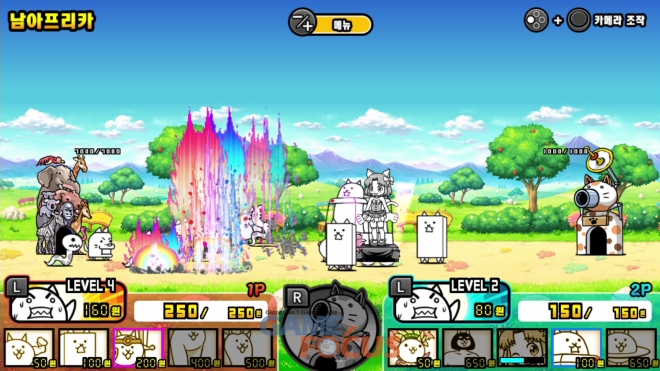 2인 플레이 시 '냥코 대포'가 2인 플레이 전용의 '초 냥코 대포'로 전환된다. '초 냥코 대포'는 어느 쪽이든 발동할 수 있으며 발동하면 에너지 게이지가 늘어난다. 둘이서 타이밍을 맞추어 게이지 양이 최대한 많을 때 발사 버튼을 누르자. 게이지가 많이 모일수록 '초 냥코 대포'의 위력이 증가한다.