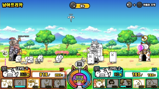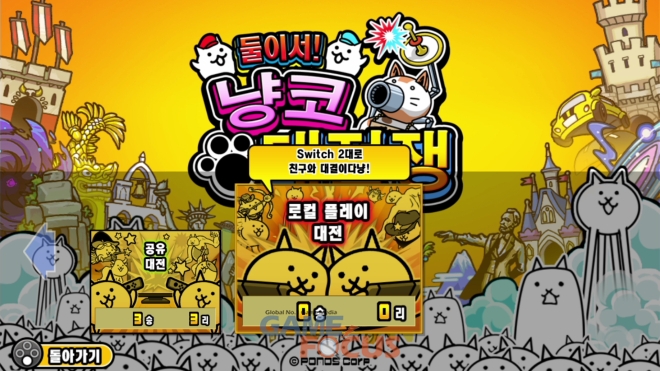 Nintendo Switch™용 '둘이서. 냥코 대전쟁'(한국어판)은 둘이서 협력・대전 플레이를 지원한다. 쉽고 간단한 배틀 시스템으로 남녀노소 누구나 즐길 수 있으며, 총 350개 이상의 징글귀염 냥코가 등장하는 방대한 볼륨의 스테이지를 체험할 수 있다.