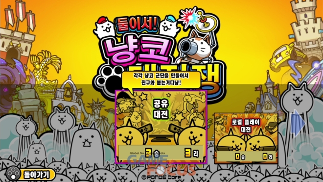 대전 모드에서는 화면 윗부분에 표시되는 전력 게이지를 체크하자. 먼저 상대의 전력 게이지를 0으로 만든 쪽이 승리한다. 대전 상대의 냥코를 격파하거나 냥코성을 공격하면 대전 상대의 전력 게이지가 줄어든다.