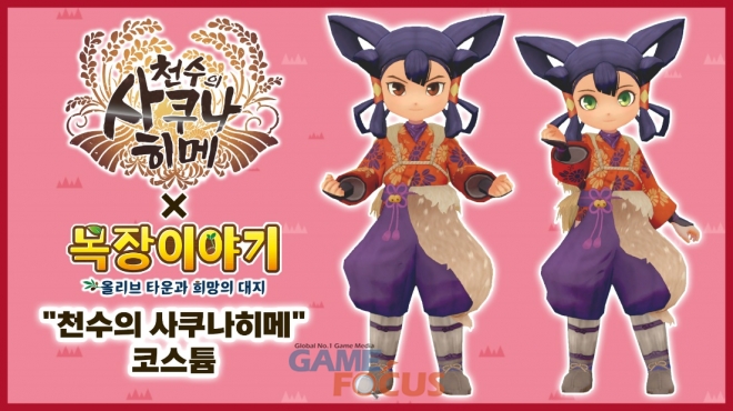 이 콜라보레이션에서는 '천수의 사쿠나히메'의 주인공 '사쿠나히메'를 모티브로 만든 신규 의상 '천수의 사쿠나히메' 코스튬이 '목장이야기 올리브 타운과 희망의 대지' 게임 내에 등장한다.