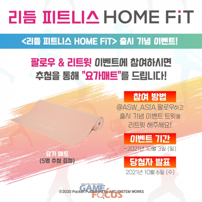 '리듬 피트니스 HOME FiT' 한국어판의 출시를 기념하여, 추첨을 통해 ‘요가매트’를 5명에게 증정하는 이벤트가 오늘부터 개최한다. 참여 방법 등 이벤트에 대한 자세한 내용은 다음과 같다.