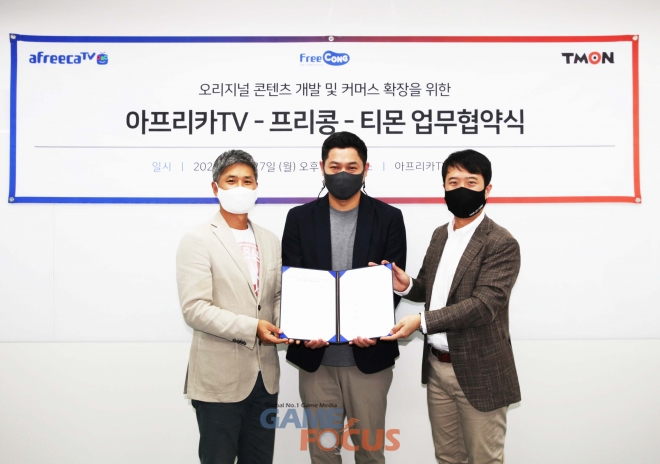 아프리카TV와 자회사 프리콩은 27일(월) 온라인 쇼핑 플랫폼 티몬과 서울 대치동에 위치한 아프리카TV 7층 회의실에서 오리지널 콘텐츠 개발 및 미디어 커머스 확장을 위한 업무협약(MOU)을 체결했다고 밝혔다. 협약식에는 아프리카TV 정찬용 대표와 프리콩 윤무철 대표, 티몬 장윤석 대표가 참석했다.