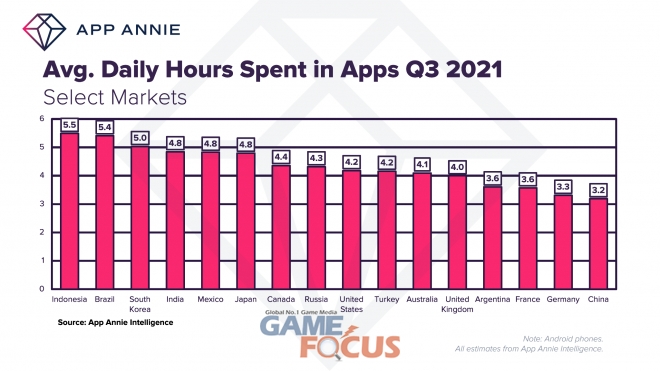 한국보다 모바일 앱 사용시간이 많은 나라는 인도네시아(5.5시간), 브라질(5.4시간)로 분석됐으며, 한국 다음으로는 인도(4.8시간), 멕시코(4.8시간), 일본(4.8시간) 순으로 모바일 앱 사용시간이 길었다.