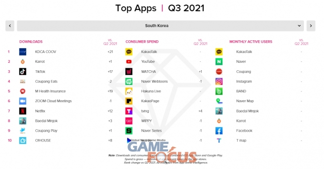 이번 3분기 한국에서 가장 많은 다운로드를 기록한 앱은 질병관리청의 ‘COOV'로, 위드 코로나 시대가 열리고 있음을 확인시켜줬다. 다운로드 2위는 ‘당근마켓’이 차지했는데, 이는 재택근무 등 집에서 보내는 시간이 늘어나면서 집 인근에서 거래하는 사용자들의 니즈가 반영된 것으로 분석된다. 3위는 ‘틱톡’이 차지했는데, 이 역시 집에서 보내는 시간이 늘어나면서 다양한 형식의 비대면 커뮤니케이션을 원하는 사용자들의 니즈가 반영됐다는 평가다. 뒤이어 ‘쿠팡 이츠’, ‘The건강보험’, ‘줌 클라우드 미팅’, ‘넷플릭스’, ‘배달의민족’, ‘쿠팡 플레이’ 및 ‘오늘의집’ 등이 탑 10에 오르면서 위드 코로나 시대에 모바일 중심의 라이프스타일이 안착하고 있음을 보여줬다.