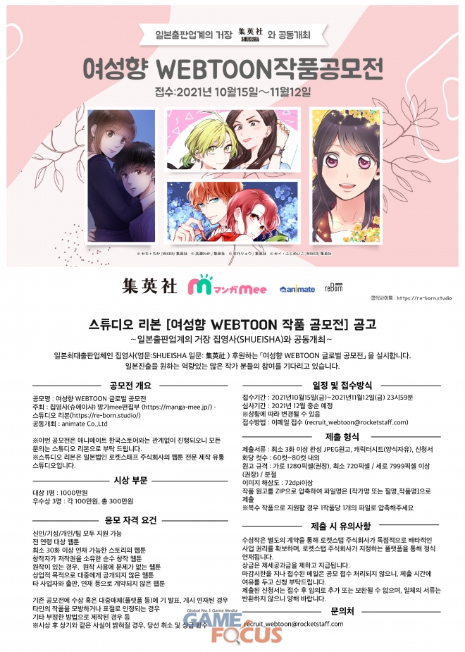 로켓스태프(대표이사 고영욱, 일본 법인 애니메이트 그룹)는 자사 웹툰 스튜디오인 ‘스튜디오 리본'을 통해 '원피스', '슬램덩크' 등 세계적인 작품을 출판한 집영사(슈에이샤), 현지 최대 애니메이션 굿즈 유통 업체인 애니메이트(animate)와의 공동개최로 진행하는 '여성향 WEBTOON 글로벌 공모전'을 실시한다고 11일 밝혔다.