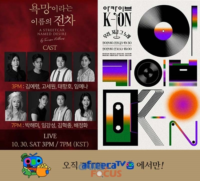 아프리카TV는 22일과 23일 실력파 뮤지션들이 출연하는 '아카이브 케이온(Archive K-ON) : 우리, 지금 그 노래'를 생중계한다. 이어 30일에는 테네시 윌리엄스 퓰리처상 수상작 연극 '욕망이라는 이름의 전차(A Streetcar Named Desire)'를 생중계한다.