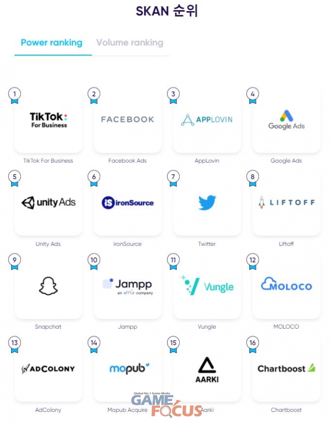 9월 30일 기준, 새로운 측정 프레임워크 SKAN에 가장 잘 적응한 기업은 틱톡 포 비즈니스(TikTok for Business)였다. SKAN 성과 순위에서 파워랭킹 1위, 볼륨 랭킹 5위, 광고주 수 4위, 포스트백 수 5위를 기록했으며 광고 품질을 나타내는 유입유저 창출가치 측면에서도 우수한 성적을 획득했다.