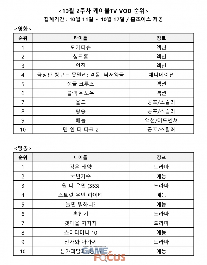 '모가디슈'와 '검은 태양'이 각각 영화, 방송 케이블TV VOD 판매 순위 1위를 기록했다.