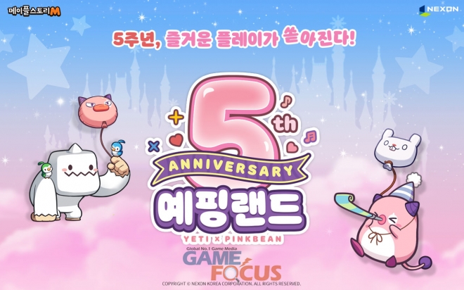 국내 서비스 5주년을 맞은 '메이플스토리M'은 이용자 성원에 보답하는 의미로, 대표 인기 몬스터인 '예티'와 '핑크빈'을 특별 이벤트 캐릭터로 추가해 다양한 즐길거리 및 보상을 제공한다.