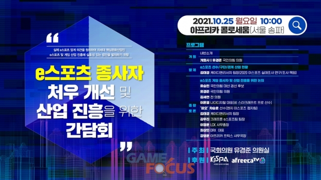 10월 25일(월) 오전 10시, 서울 송파에 위치한 아프리카콜로세움 e스포츠 경기장에서 'e스포츠 종사자 처우개선 및 산업 진흥을 위한 간담회'가 열린다.